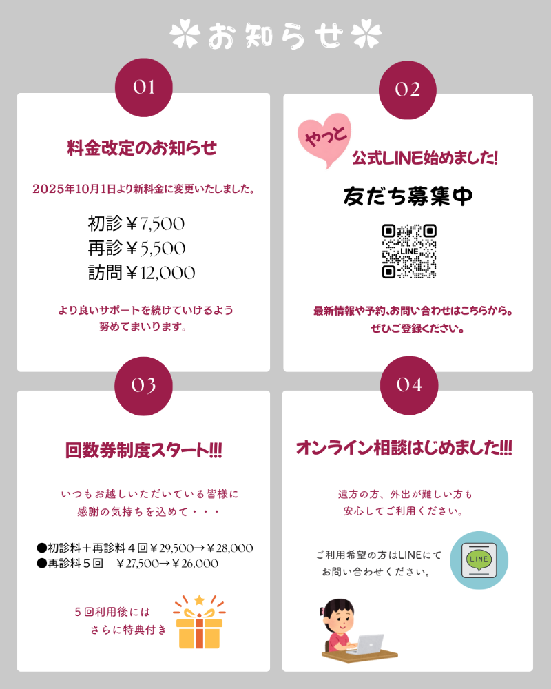 ◇時間 9:30~17:00◇休日 日曜、祝日 (定休日以外臨時休業あり)**休日、時間外などご相談に応じます**◇料金 ⚫︎初診 ¥7,500 ⚫︎再診 ¥5,500 ⚫︎出張料金 ¥12,000 (別途交通費請求あり) ◉回数券5回分 初診料込みの場合 ¥29,500→¥28,000 再診料のみの場合 ¥27,500→¥26,000◇出張エリア 大田区、品川区、港区など
